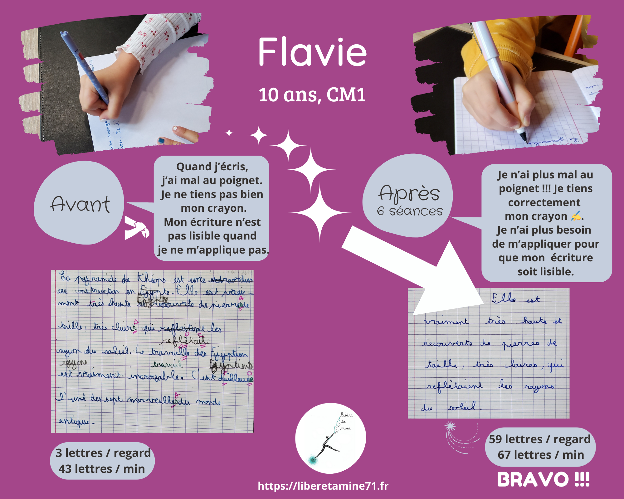En seulement quelques séances, son écriture s’est véritablement métamorphosée. Plus de douleurs et surtout plaisir d’écrire et confiance retrouvée !!!