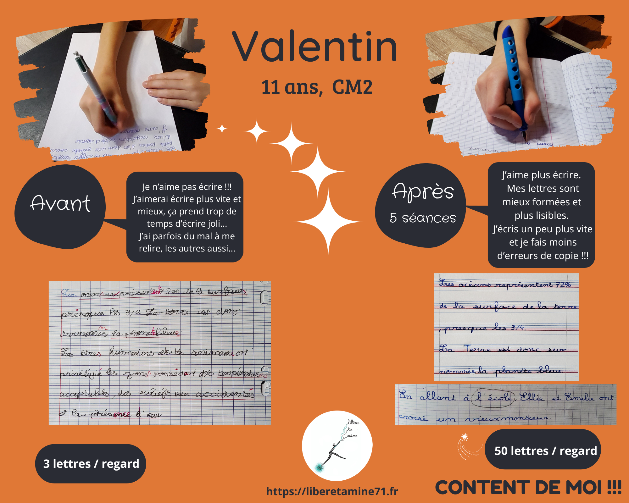 Alors grâce à votre travail notre fille de 10 ans a pu reprendre les bases de l’écriture et avoir enfin une photo écriture top.